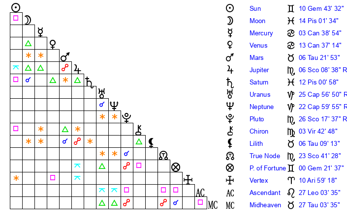 | Pluto | 26 Scorpio 17 | 3 Aquarius 38 | 25 Scorpio 34 |