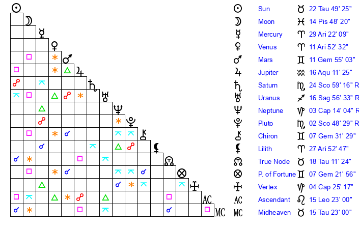 | Venus | 11 Aries 53 | 8 Aries 47 | 15 Taurus 44 |
