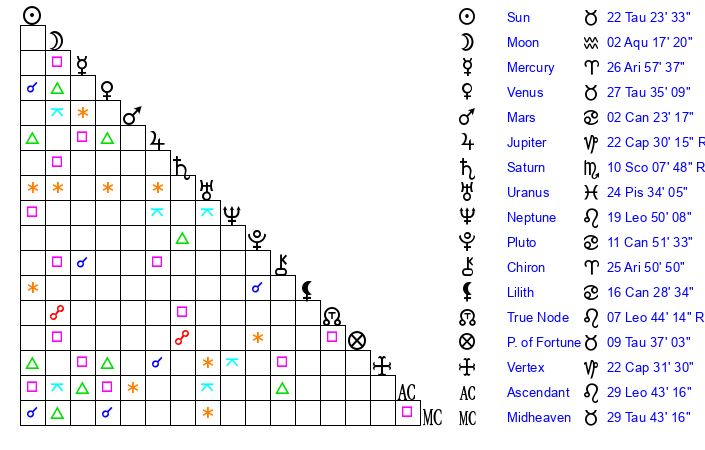 | Sun | 22 Taurus 24 | 23 Taurus 11 | 28 Leo 6 |