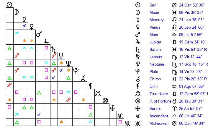 Pluto | 14 Virgo 24 | 2 Aquarius 45 | 16 Virgo 21 |