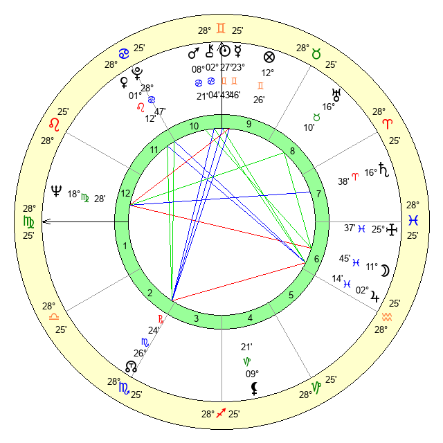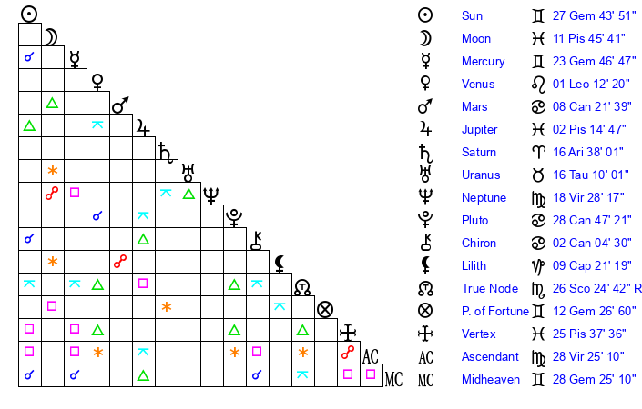 | Sun | 27 Gemini 44 | 28 Gemini 40 | 21 Virgo 12 |
