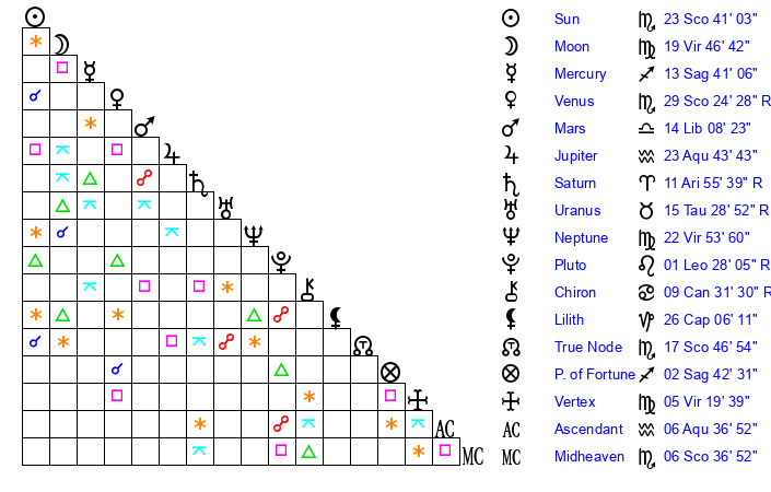| Moon | 19 Virgo 42 | 15 Libra 38 | 28 Scorpio 11 |