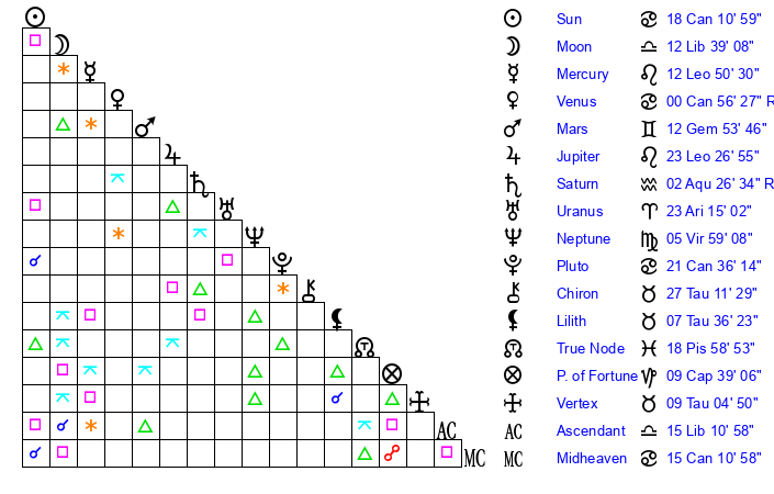 | Moon | 12 Libra 40 | 16 Capricorn 59 | 16 Pisces 19 |