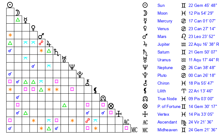 | Sun | 22 Gemini 46 | 23 Gemini 53 | 9 Libra 38 |