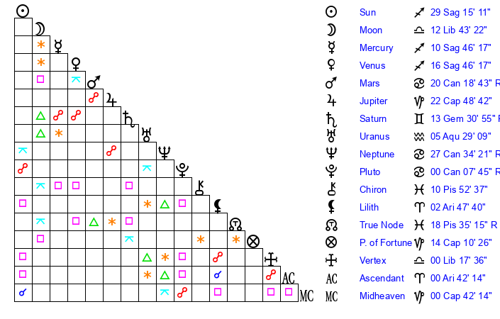 | Sun | 29 Sagittarius 15 | 0 Capricorn 5 | 21 Aries 56 |