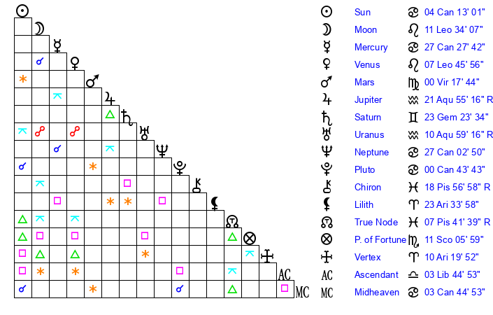 | Pluto | 0 Cancer 44 | 3 Aquarius 13 | 2 Cancer 12 |