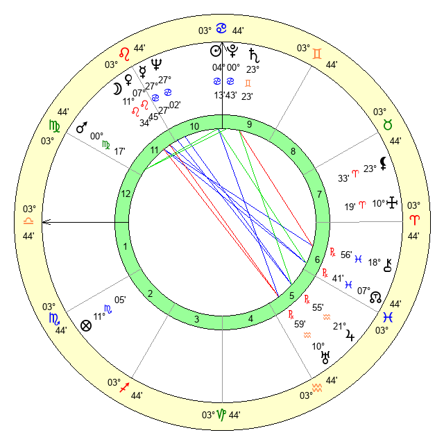 | Moon | 11 Leo 41 | 22 Cancer 20 | 2 Virgo 19 |