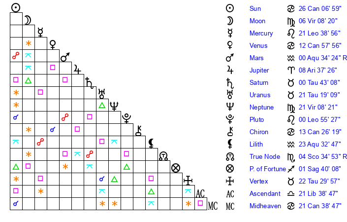 | Sun | 26 Cancer 6 | 27 Cancer 16 | 19 Libra 27 |