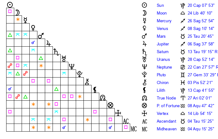 | Moon | 24 Libra 38 | 2 Scorpio 58 | 21 Sagittarius 57 |