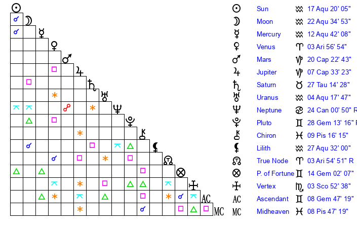 | Sun | 17 Aquarius 20 | 18 Aquarius 9 | 7 Gemini 41 |