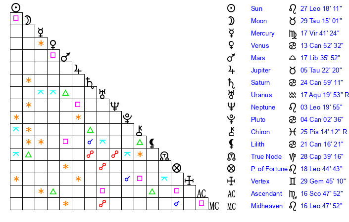 | Sun | 27 Leo 18 | 27 Leo 55 | 15 Sagittarius 17 |
