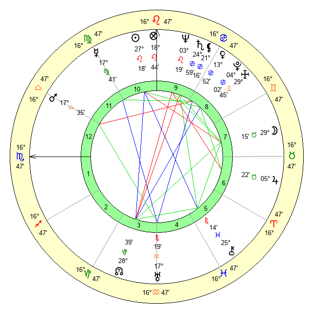 | Mercury | 17 Virgo 42 | 9 Leo 26 | 22 Sagittarius 49 |