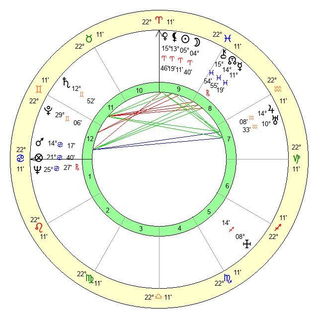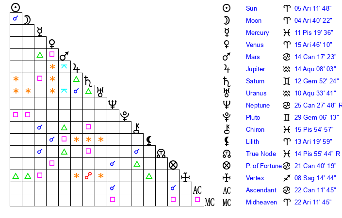 | Sun | 5 Aries 12 | 6 Aries 17 | 22 Cancer 20 |