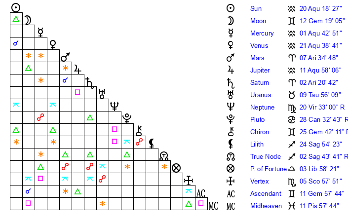 | Jupiter | 11 Aquarius 54 | 11 Gemini 19 | 29 Aquarius 8 |