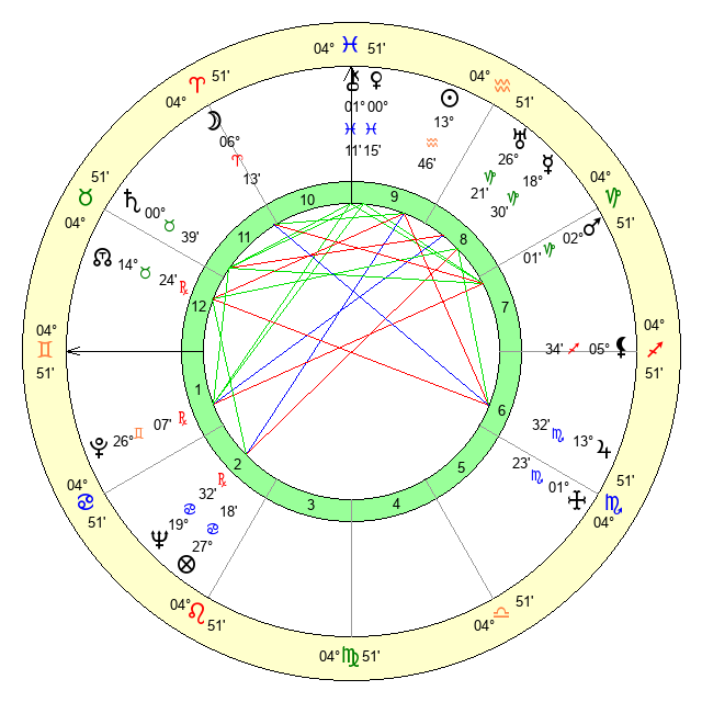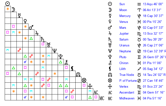 | Sun | 13 Aquarius 46 | 15 Aquarius 7 | 6 Gemini 14 |