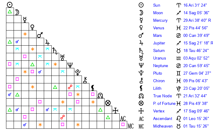 | Sun | 16 Aries 31 | 17 Aries 8 | 5 Leo 12 |