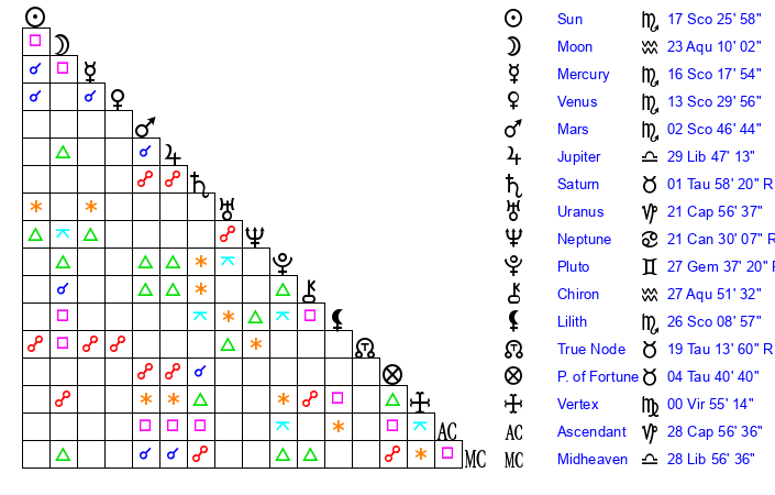 | Sun | 17 Scorpio 26 | 18 Scorpio 33 | 14 Pisces 1 |