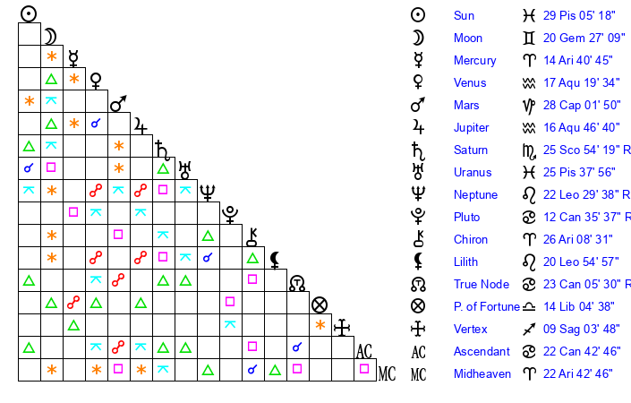 Pluto | 12 Cancer 36 | 3 Aquarius 20 | 14 Cancer 1 |
