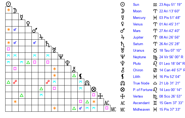 | Sun | 23 Aquarius 51 | 25 Aquarius 15 | 17 Taurus 56 |