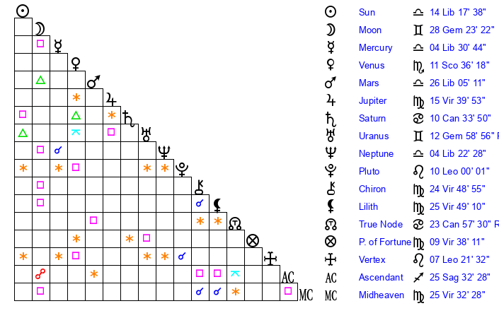 | Neptune | 4 Libra 23 | 0 Aries 21 | 6 Libra 24 |