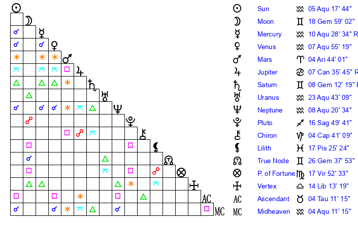 Sun | 5 Aquarius 18 | 5 Aquarius 43 | 28 Aquarius 36 |
