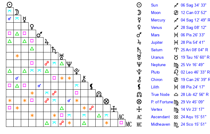 | Sun | 6 Sagittarius 35 | 7 Sagittarius 43 | 3 Pisces 56 |
