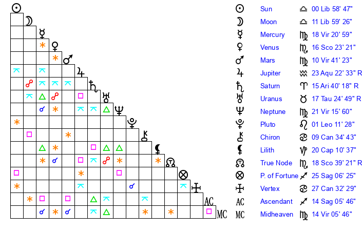 | Moon | 11 Libra 56 | 3 Scorpio 59 | 16 Sagittarius 27 |