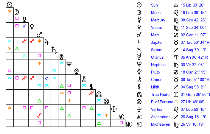 | Sun | 15 Libra 10 | 15 Libra 40 | 23 Capricorn 3 |