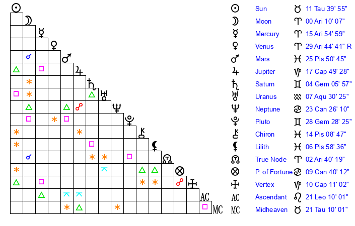 | Sun | 11 Taurus 40 | 12 Taurus 32 | 28 Leo 58 |