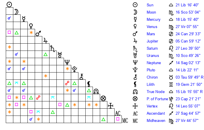 Pluto | 14 Libra 23 | 29 Capricorn 38 | 16 Libra 0 |