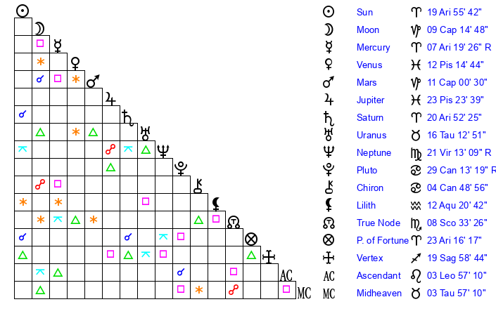 | Sun | 19 Aries 55 | 21 Aries 4 | 12 Cancer 45 |