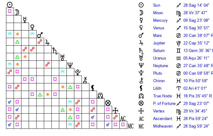 | Sun | 28 Sagittarius 14 | 29 Sagittarius 4 | 20 Aries 57 |