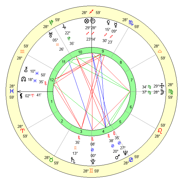 | Moon | 28 Virgo 35 | 6 Capricorn 10 | 7 Scorpio 21 |