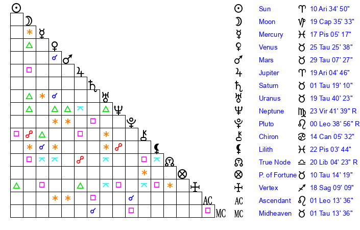 | Moon | 19 Capricorn 36 | 9 Taurus 14 | 26 Aquarius 30 |