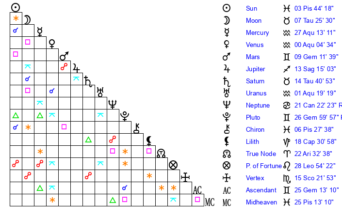 | Sun | 3 Pisces 44 | 5 Pisces 20 | 24 Gemini 11 |