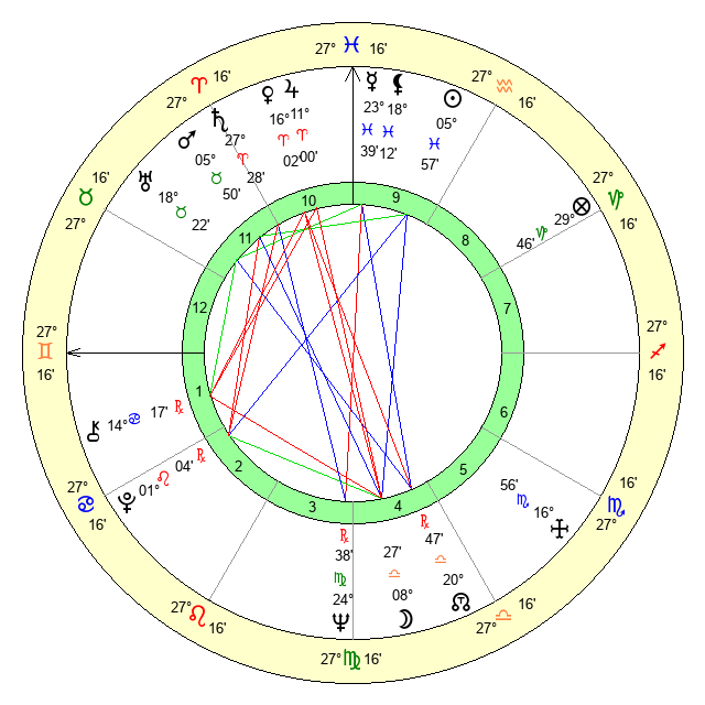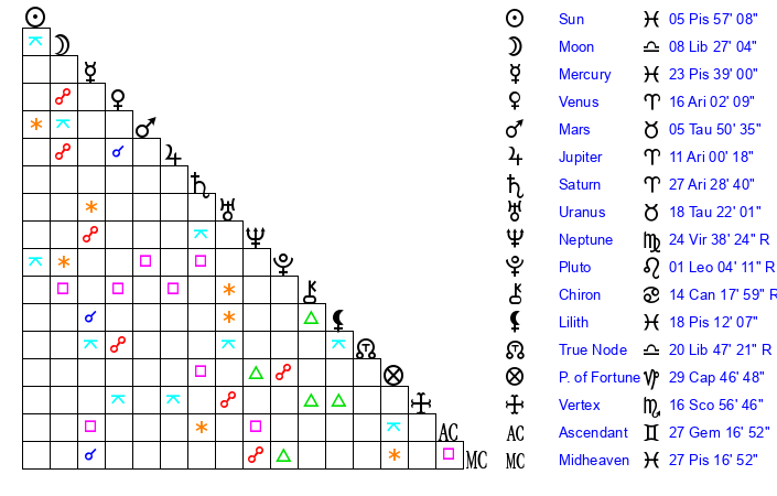 | Sun | 5 Pisces 57 | 7 Pisces 20 | 29 Taurus 30 |