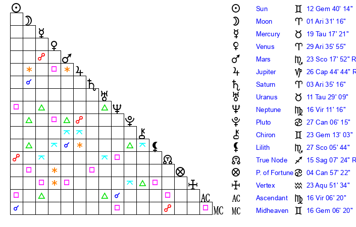 | Sun | 12 Gemini 40 | 13 Gemini 22 | 6 Virgo 53 |