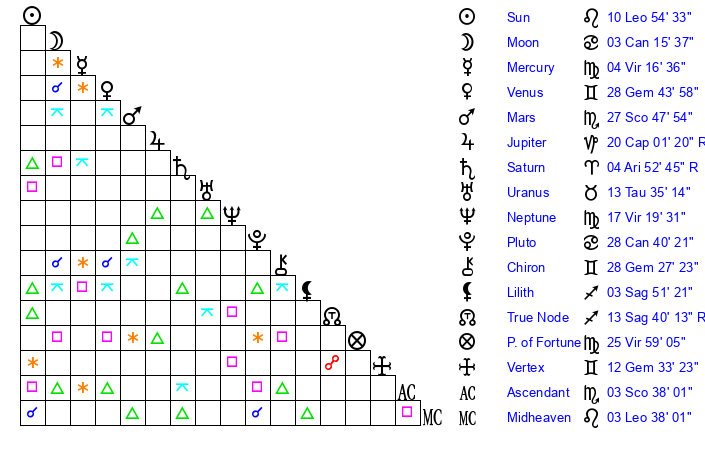 | Sun | 10 Leo 54 | 11 Leo 36 | 6 Scorpio 51 |