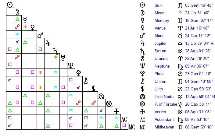 | Sun | 3 Gemini 46 | 4 Gemini 44 | 0 Virgo 49 |
