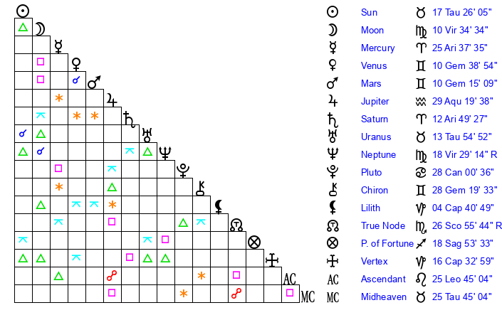 | Mercury | 25 Aries 37 | 27 Aries 2 | 7 Virgo 39 |