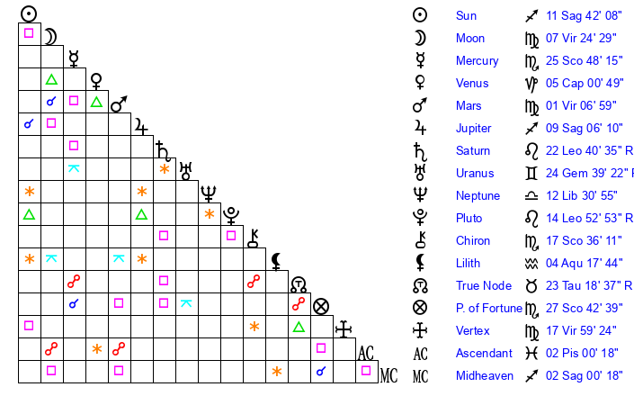 | Moon | 7 Virgo 16 | 9 Gemini 5 | 4 Cancer 54 |