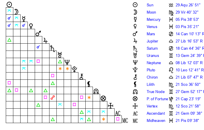 | Sun | 29 Aquarius 27 | 0 Pisces 17 | 17 Taurus 29 |