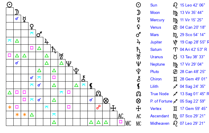 | Moon | 13 Virgo 39 | 8 Aquarius 41 | 28 Scorpio 37 |