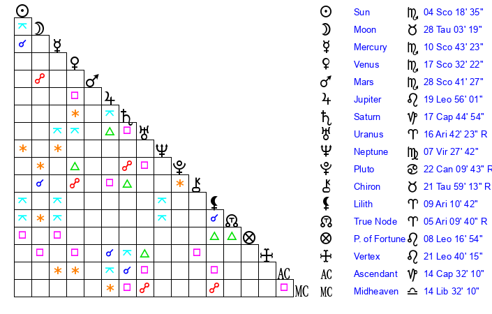 | Moon | 28 Taurus 7 | 24 Capricorn 21 | 13 Scorpio 37 |