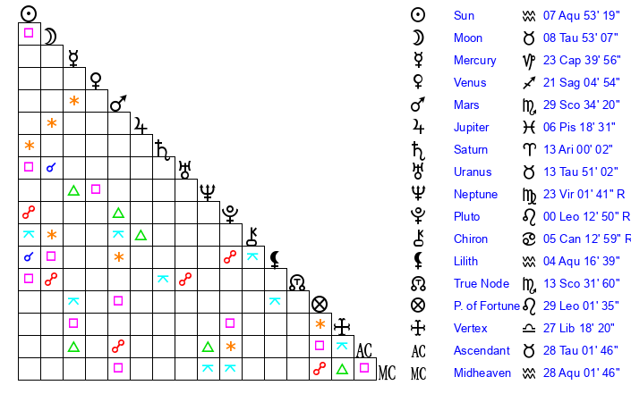 | Sun | 7 Aquarius 53 | 9 Aquarius 2 | 3 Taurus 36 |