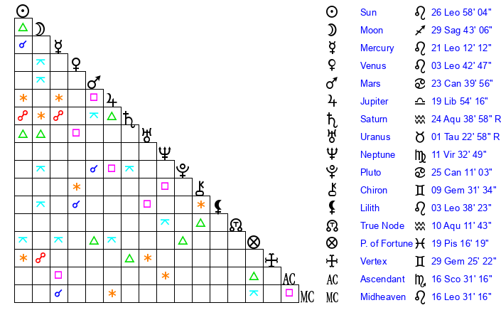 | Venus | 3 Leo 43 | 24 Cancer 4 | 26 Scorpio 51 |