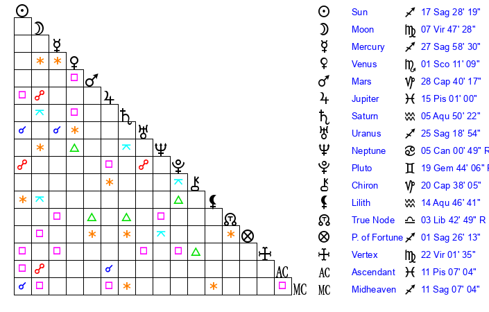 | Moon | 7 Virgo 36 | 5 Virgo 12 | 22 Aquarius 44 |