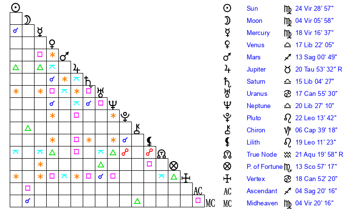 | Mercury | 18 Virgo 17 | 28 Virgo 16 | 9 Sagittarius 31 |