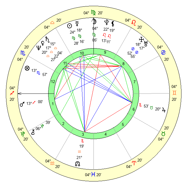 | Moon | 4 Virgo 10 | 3 Leo 1 | 11 Taurus 29 |