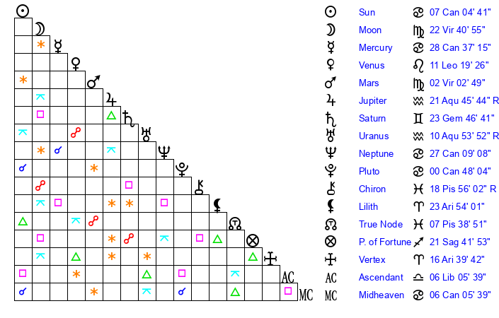 | Neptune | 27 Cancer 10 | 2 Aries 9 | 0 Leo 23 |